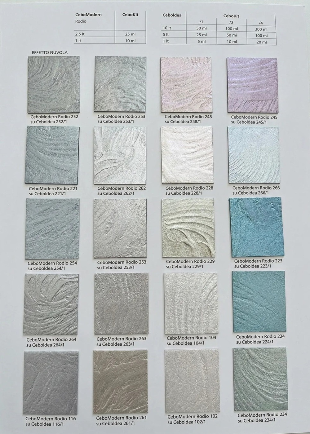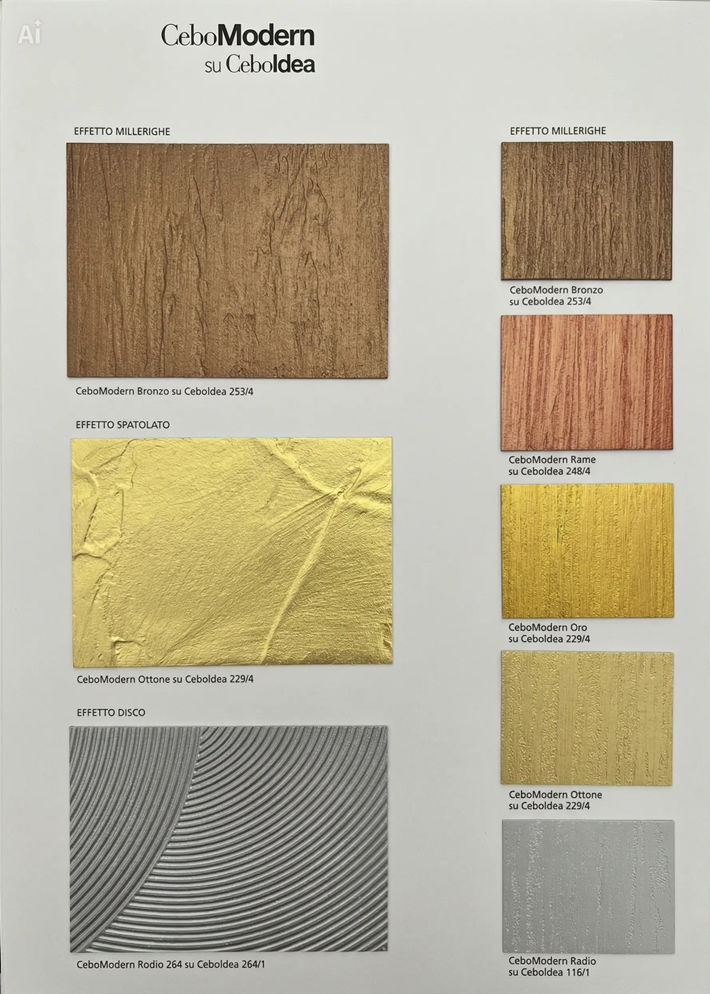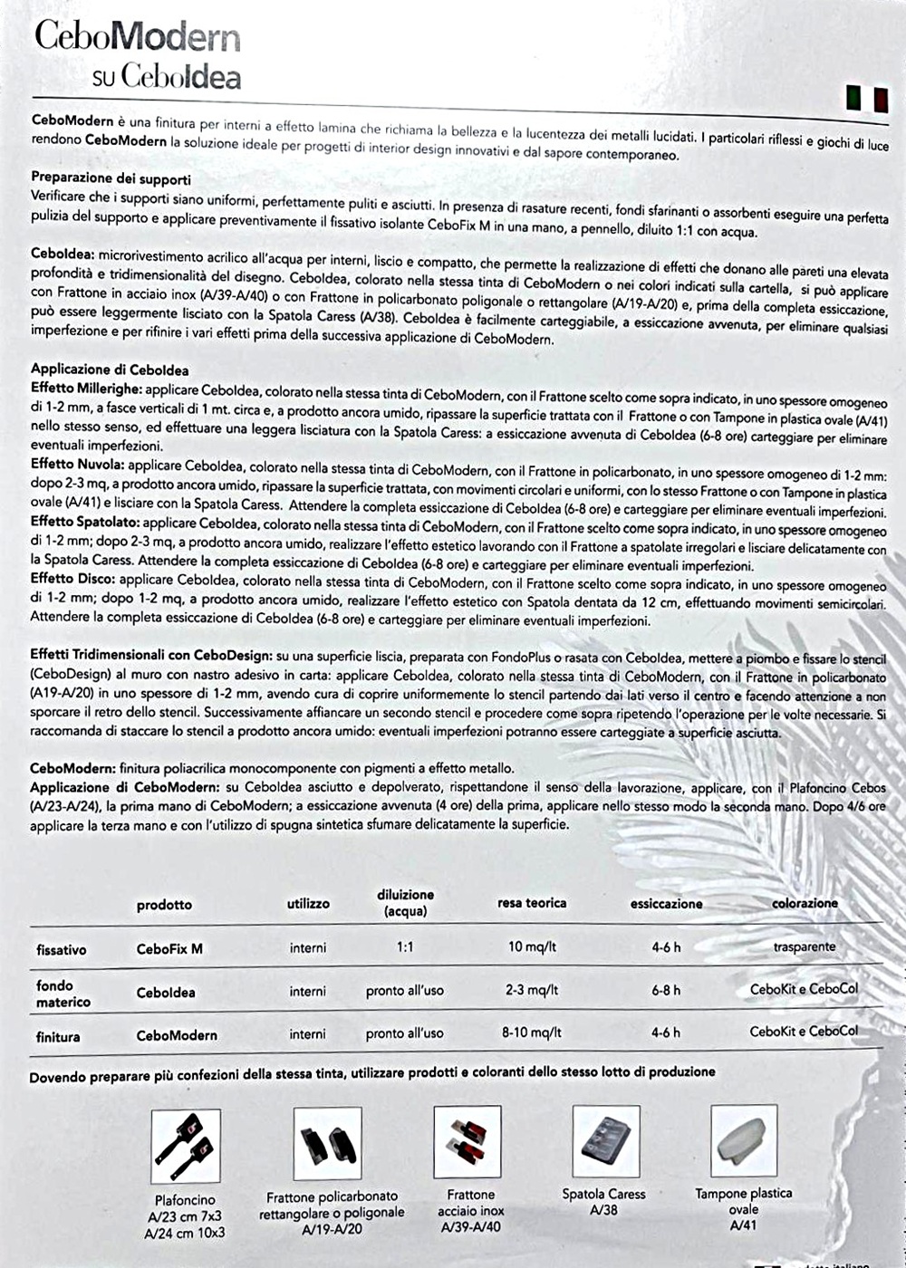 L’effetto decorativo viene esaltato dalla successiva applicazione di CEBOSTYLE ANTICO, CEBOSI SETOSO, CEBOSI RIFLESSI o CEBOSI UNIVERSAL: dopo 6-8 ore